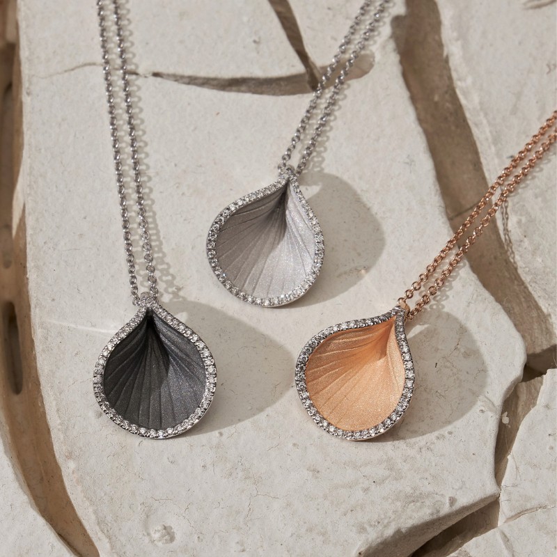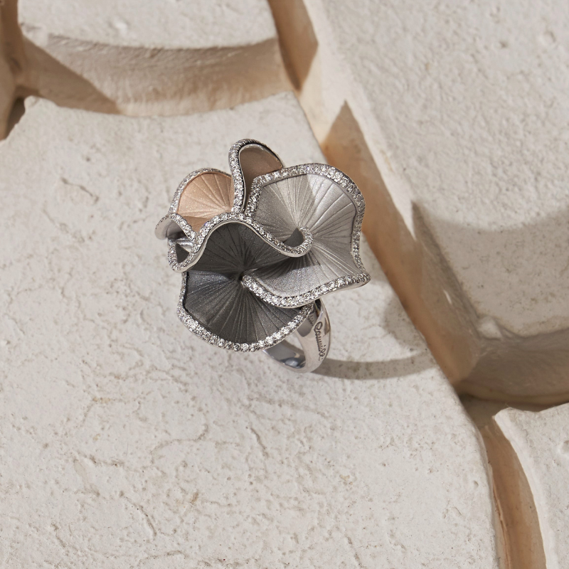 Die Signaturfarbe der Marke - Oro 2000 - ist ein warmes Gelbgold mit einem unverwechselbaren Glanz, der durch eine spezielle Mischung aus 18-karätigem Gold und Kupfer entsteht. Ein weiterer einzigartiger Farbton ist Oro Bianco, ein Weißgold, das dank eines geringen Palladiumanteils einen weicheren, wärmeren Ton hat als herkömmliches Weißgold.