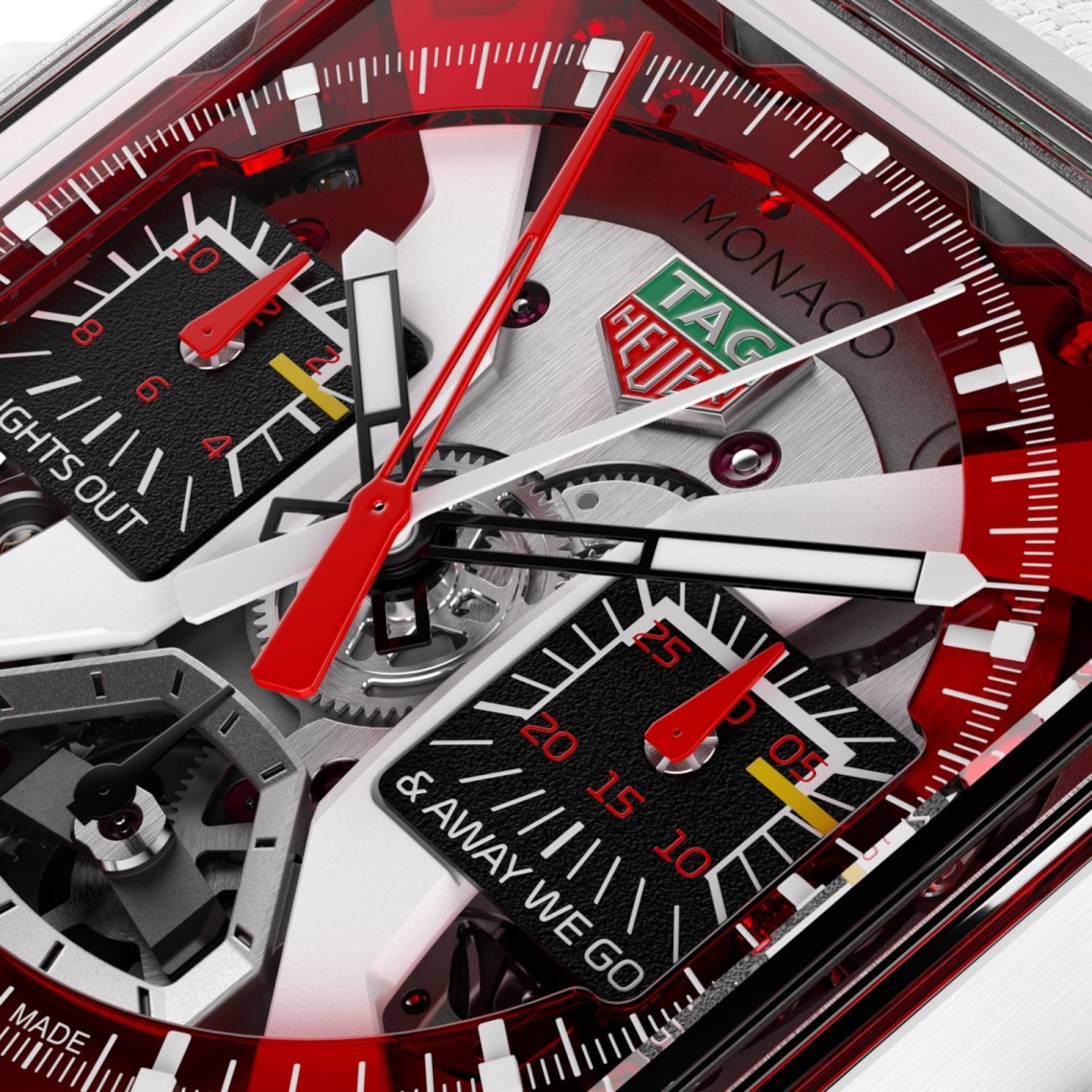 Kraftvolles Design trifft auf technische Raffinesse: Das rot getönte, transparente Zifferblatt gibt den Blick auf das Uhrwerk frei und zitiert die Dynamik des Motorsports. Bei 12 Uhr befindet sich das handlackierte TAG Heuer-Wappen, während bei 6 Uhr ein dezentes F1®-Logo im Minutenring die Verbindung zur Rennstrecke aufnimmt. Die Schleppzeiger-Chronographenzähler erinnern an das Grid-Design der Startaufstellung und tragen den bekannten Startschuss-Schriftzug „LIGHTS OUT & AWAY WE GO“.